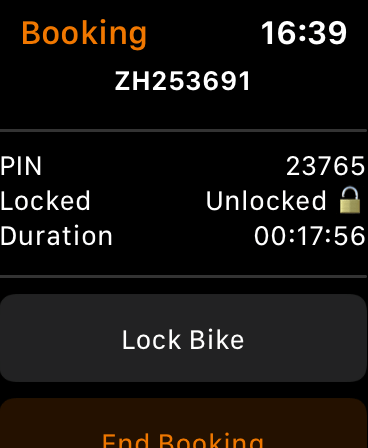 After launching the App and assuming you’re logged in, it lists the bikes around you, sorted by distance to your current location (they have both black (smaller) and white (bigger) bikes – hence the coloring):