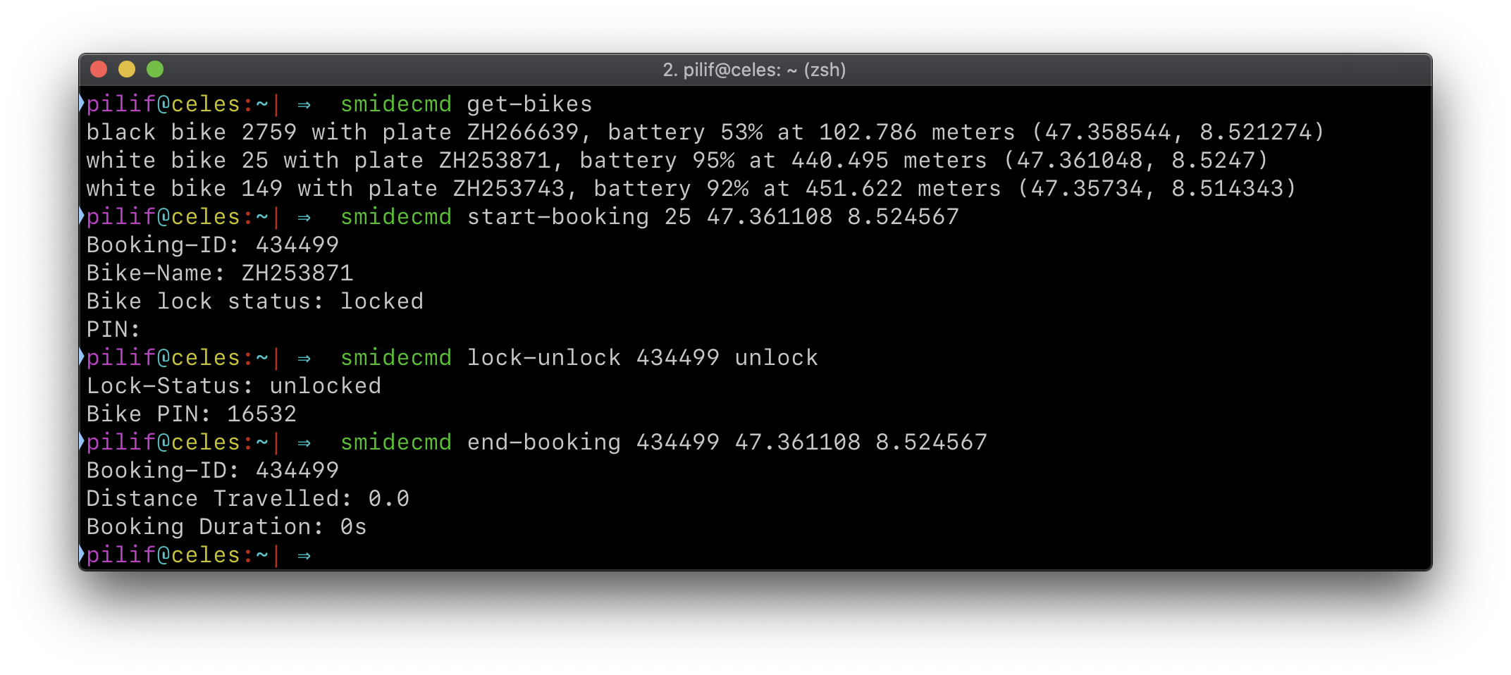 The first user of SmideKit would be a macOs command-line frontend called smidecli. It would offer various subcommands for listing bikes, booking them and ending bookings.